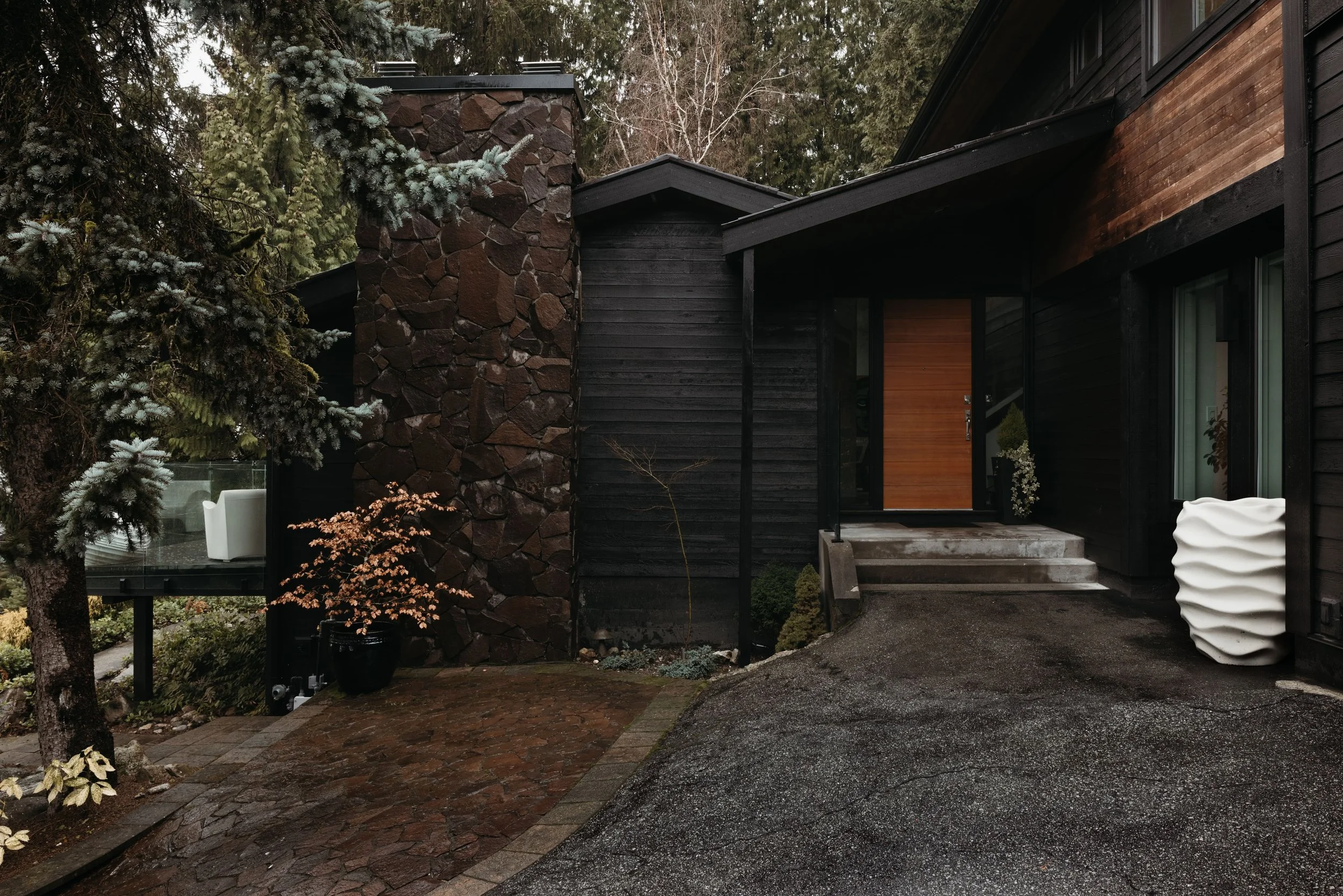 From the driveway, the house presents a quiet elevation framed by the verdant layers of a lushly planted entry garden. This threshold buffers the home from the outside world, heightening the sense of privacy before revealing a striking material contrast: a dark, textured envelope of wood siding punctuated by the warmth of red cedar soffits. It is the first indication of the light-filled interior beyond the front door.
