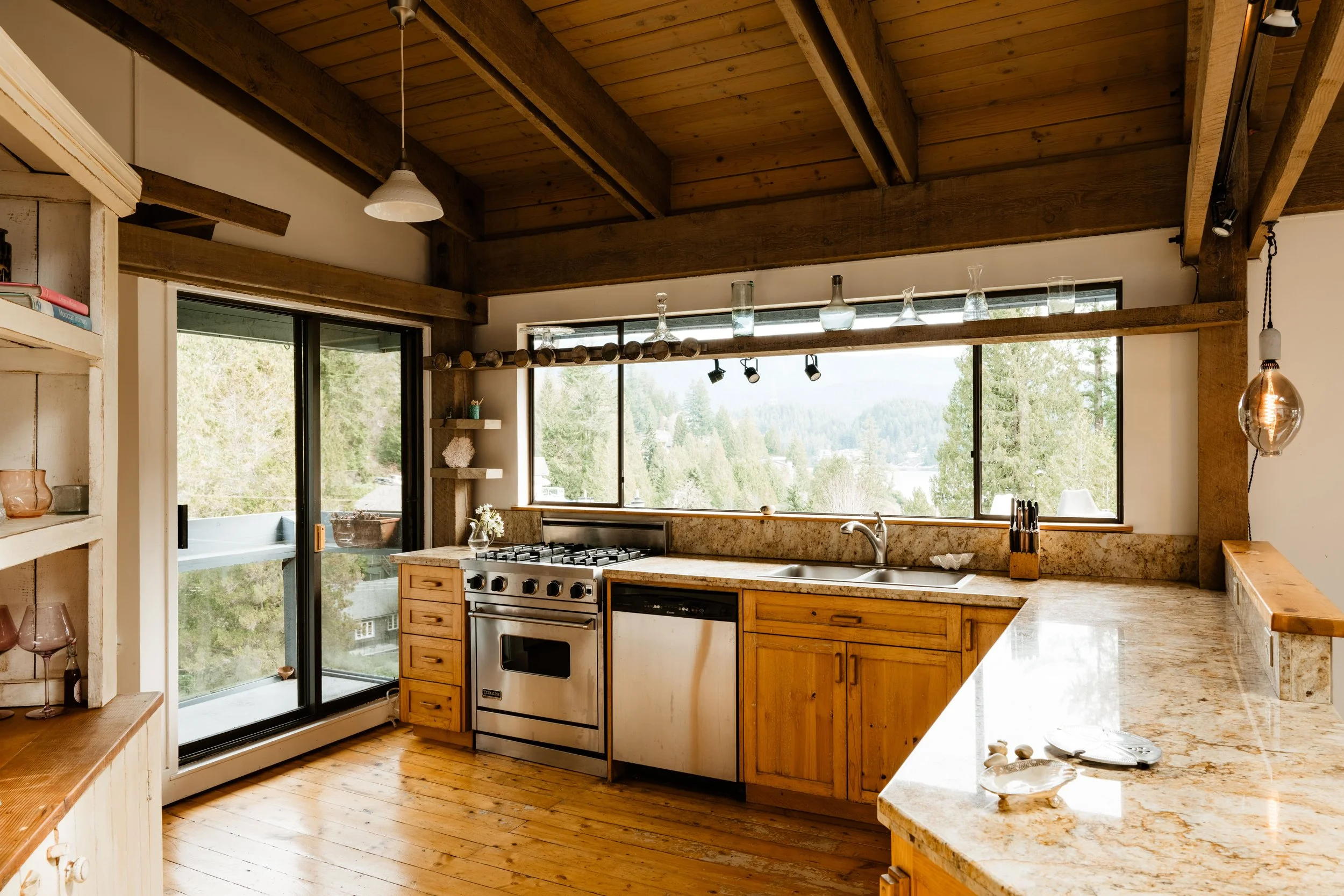 At the kitchen, a broad expanse of glazing frames a layered view of trees, rocks, and water beyond, transforming daily routines into something more considered.