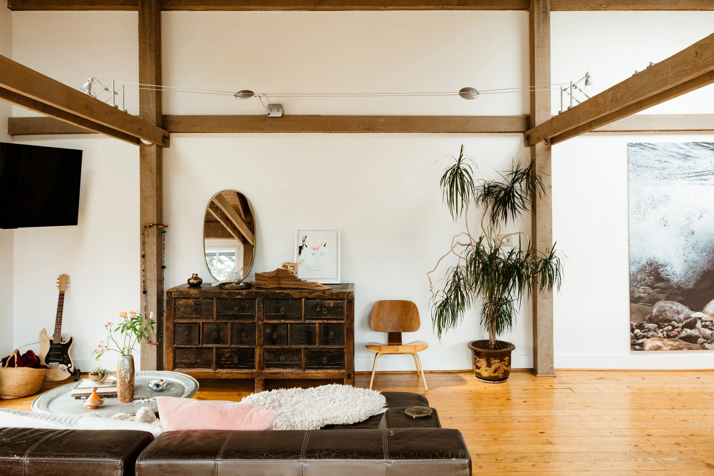 The private spaces of the home occupy the middle level, where the connection to the landscape becomes more immediate and enclosed. The north-facing primary bedroom is quietly luminous, structurally expressive with exposed wood beams prominently revealed, and bears a direct relationship to the outdoors. To the south, the second bedroom opens to a covered deck, where an original wooden barrel hot tub remains nestled within the natural setting. Both spaces are sized generously, creating ample opportunity for the display of furnishings and artwork.