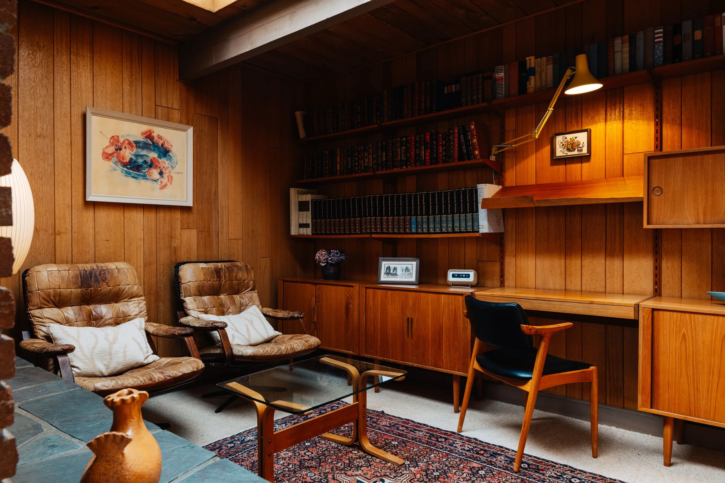 At the centre of the plan sits a study of an entirely different character. Where the rest of the home opens itself freely to the garden and the sky, this room turns inward, its walls and ceiling clad entirely in cedar planks that give it the quality of a warm, sheltered retreat. Original millwork lines one wall, providing a generous built-in desk and an abundance of storage, while a fireplace, smaller in scale but equal in dignity to the one in the living room, anchors the space with the same material conviction. It is a room that exists productively at odds with the openness of its surroundings, a place for quiet thought within a home otherwise given over to the pleasures of the outdoors.