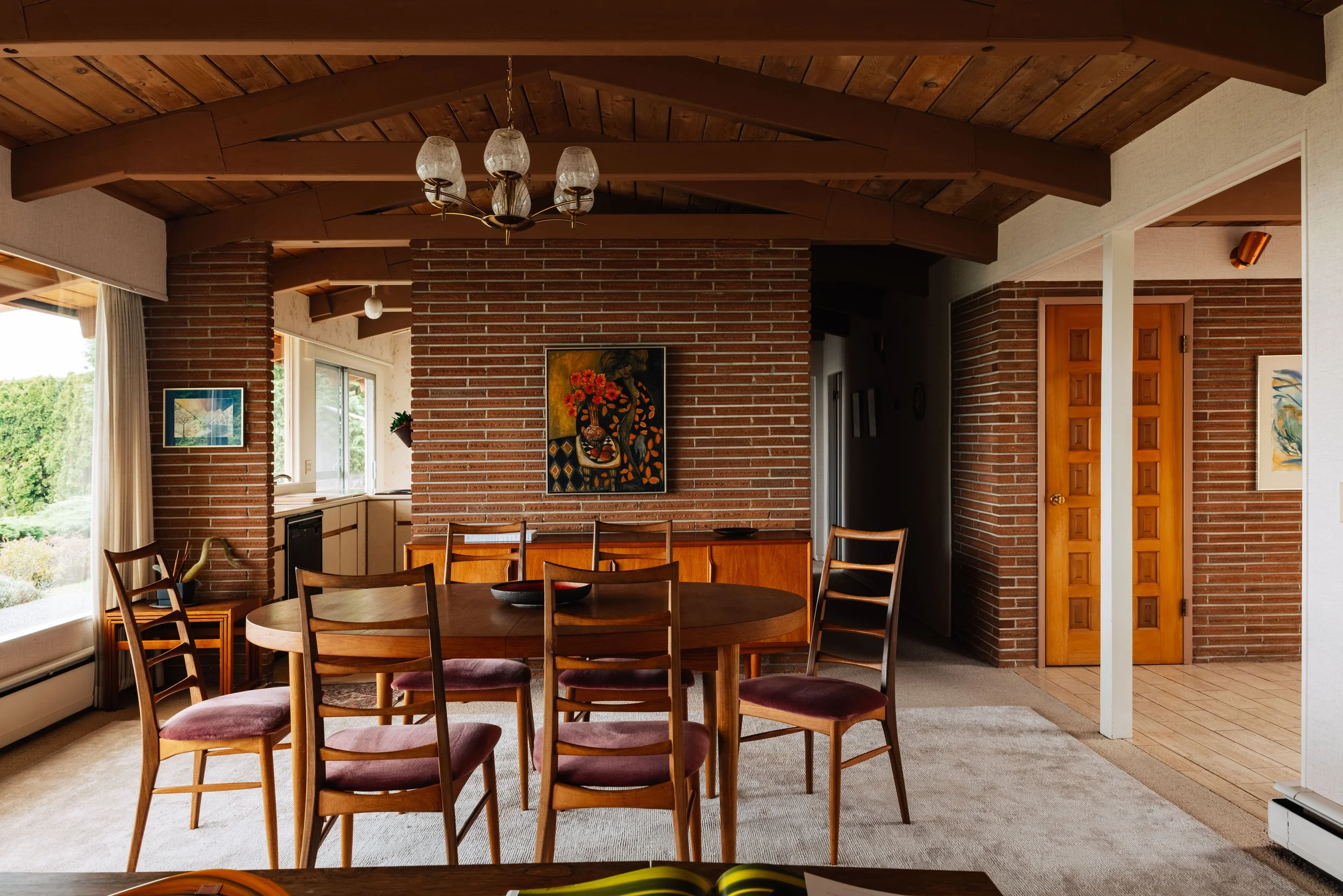 The living and dining room is the heart of the Resort House, and the space where Bob Lewis's design philosophy finds its fullest expression. It is a long, generous room, bookended at either end by two noble walls of elongated clay brick laid in a running bond pattern, their warm terracotta presence grounding the space with a solidity that the surrounding glazing only amplifies by contrast. Spanning between them, a series of sloped timber beams march with quiet regularity across the full width of the room, rising to form a vaulted cedar-clad ceiling above and creating a fifteen-foot clear span that frees the living and dining spaces below from any sense of enclosure.