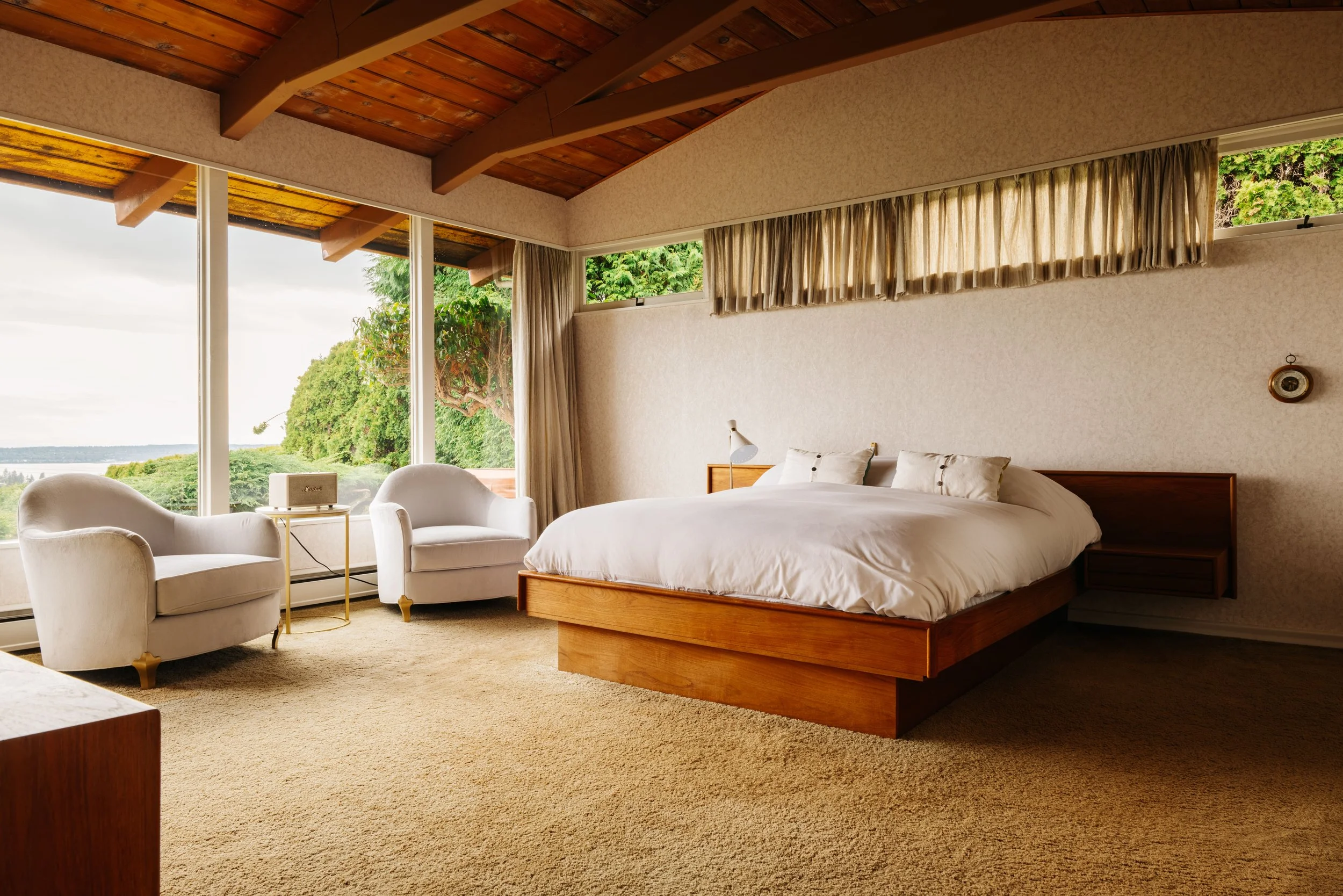 The primary bedroom is among the most quietly accomplished spaces in the home. Wall-to-wall southern windows and transom windows to the west admit an abundance of natural light and frame magnificent views toward downtown Vancouver, while a small private garden just beyond the glass imparts a sense of calm that balances the drama of the exposed timber beams and tongue-and-groove cedar ceiling above. The room is generous in every sense, equipped with its own ensuite, walk-in closet, and a wood-clad private sauna that speaks directly to the wellness philosophy the family brought to this home from the very beginning.