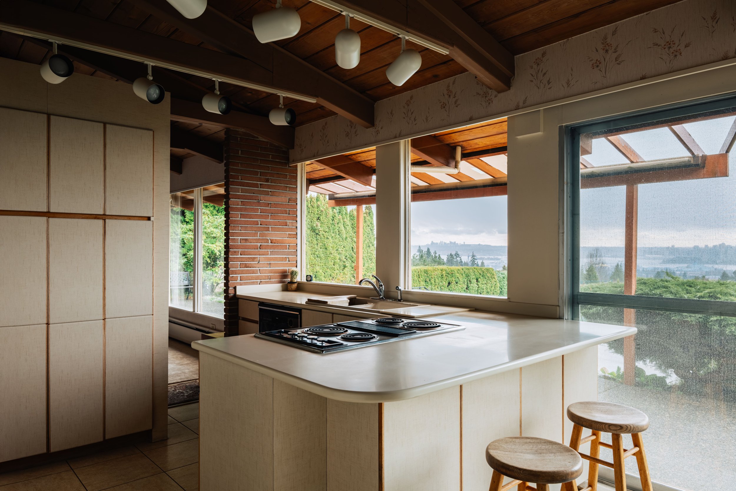 Tucked behind the west interior wall of the living and dining room, the kitchen occupies a position at the heart of the home's social life. Though enclosed, it is anything but isolated. A wide peninsula with bar seating creates an easy connection to the dining area, while a run of windows along the southern wall opens directly onto the patio, ensuring that the cook is never far from the conversation or the view. The waters of Burrard Inlet are visible from the kitchen counter, a reminder that in this house, no space was considered too utilitarian to share in the views that define the home.
