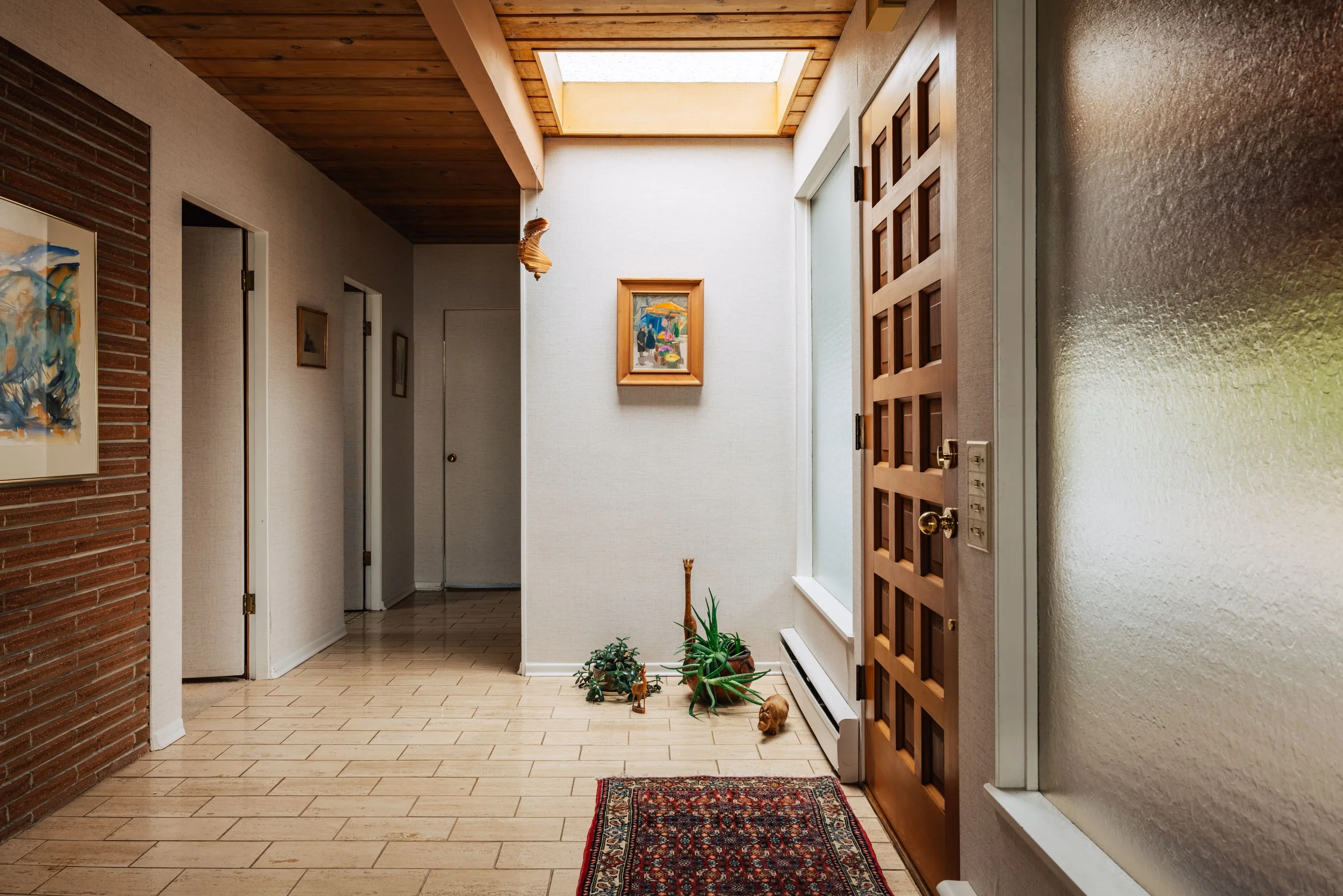 Stepping inside, the entry vestibule immediately sets the tone for what follows. Bright, airy, and luminous, it is a space that announces the home's intentions without overstating them. A skylight punches light downward through the cedar-clad ceiling above, illuminating the tiled floor below and drawing the eye toward the clay brick wall that faces the entry, a first hint of the material richness to be found further within.