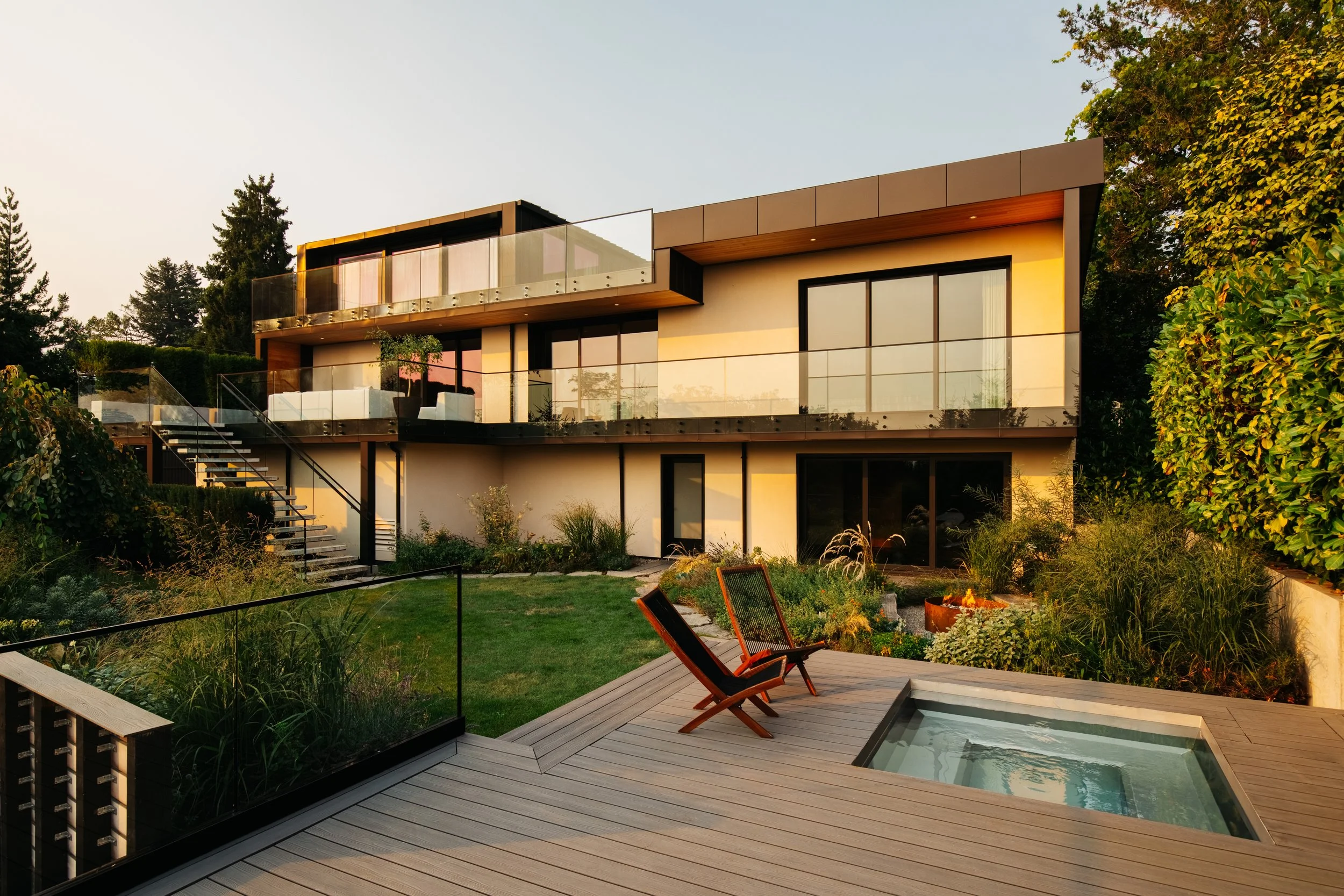 Features: Infrared sauna, hot tub, three disappearing glass wall systems, library, studio