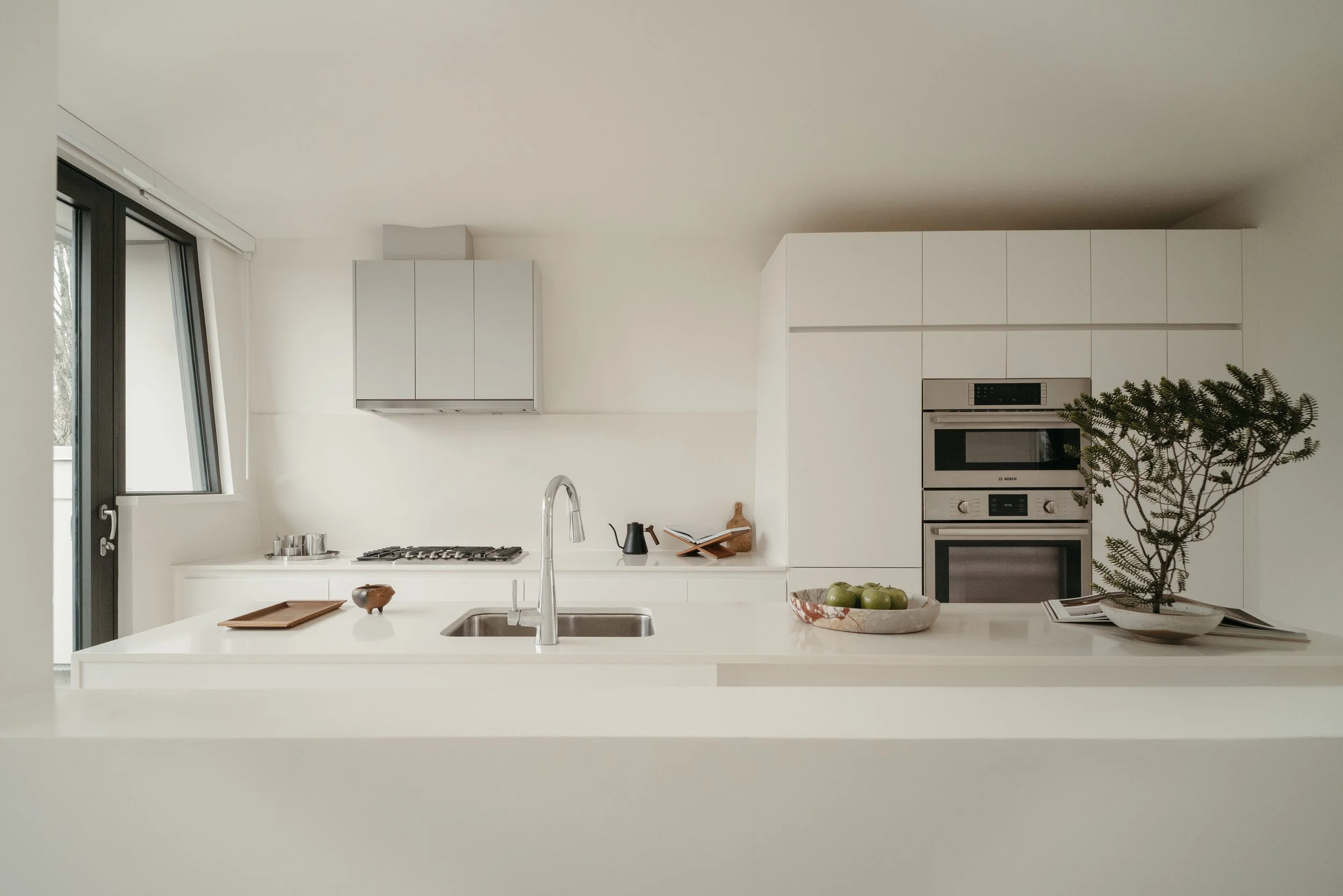 Finally, the experience culminates on the third floor in the social heart of the home, where a large central island anchors the open-plan living space and dual patios extend the interior outward. The 300 square-foot north-facing terrace captures evening light and layered city views, while the south-east patio welcomes morning sun and a closer connection to the tree-lined streetscape below.